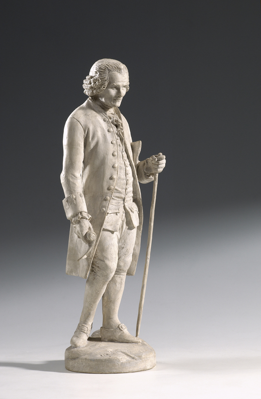 Jean-Jacques Rousseau, debout, avançant pied gauche en avant, tête nue, en perruque, dans son habit à la française, col ouvert, jabot, enveloppé dans une cape jetée sur ses épaules (style manteau de postillon). Il relève le pan droit de ses deux mains, on voit les manches de sa chemise [à dentelle]; la main gauche tient un livre, la droite un bouquet de plantes. La tête regarde un peu vers le bas, tournée de trois-quart[s] à droite; chaussé de souliers à boucle.