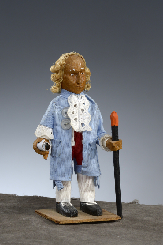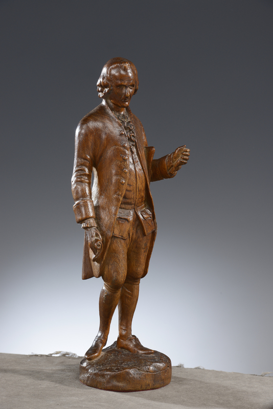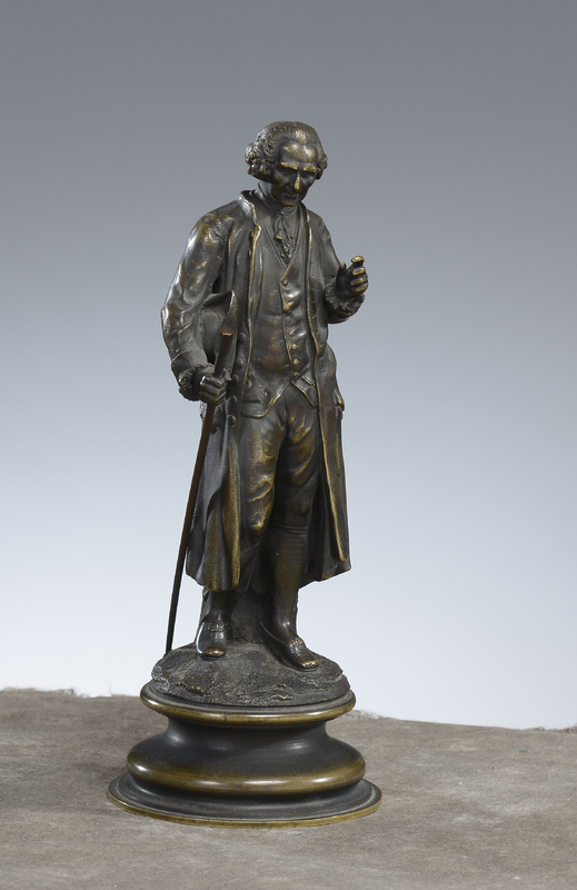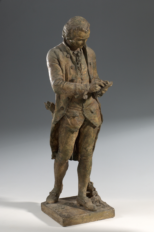Statuette en plâtre vernissé entièrement en bistre, d'après celle de Suzanne, Rousseau «dans l'attitude de marcher» (P. P. Plan, les Gazettes de Paris). Comme dans l'original, il tient des feuilles de papier dans la main droite, mais il n'a pas de feuilles dans la poche gauche. La canne n'a pas été exécutée, Rousseau n'a que la poignée dans la main gauche. La ressemblance du visage n'est pas très bonne.