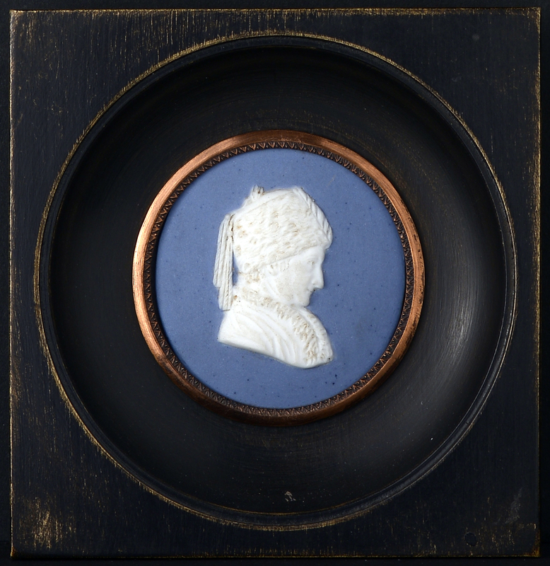 Biscuit blanc en relief genre Wedgwood à fond bleu roi, légèrement ovale, retenu par une bague de cuivre ronde ornée. Cadre presque carré en bois épais, à dépression cupulaire, teinté en noir.