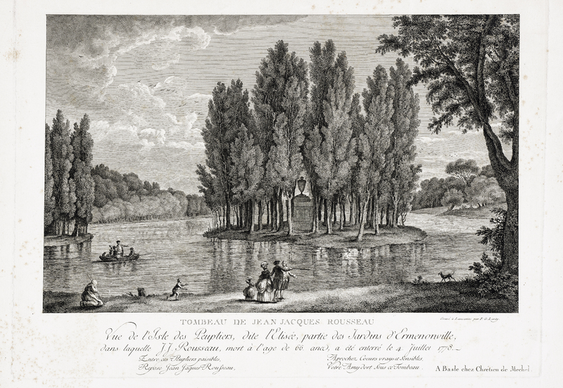 Le [premier] tombeau de Rousseau sur l'île des Peupliers. Au centre, au premier plan, une famille se promène. Dans le coin du bas à gauche, une femme agenouillée prie. Sur l'étang, à gauche, une barque avec quatre occupants.