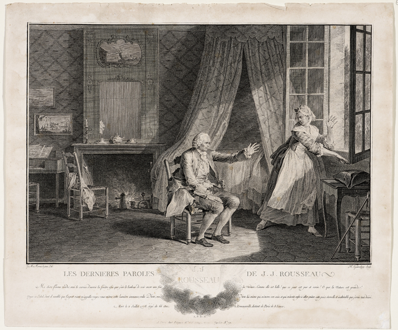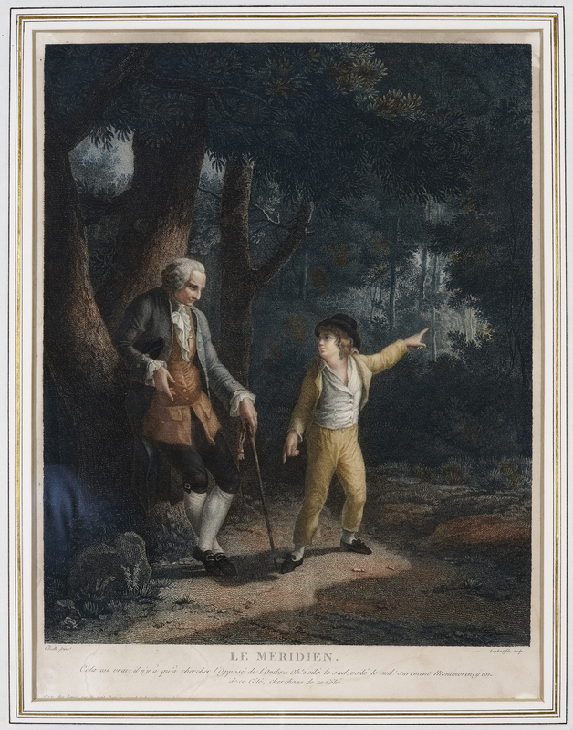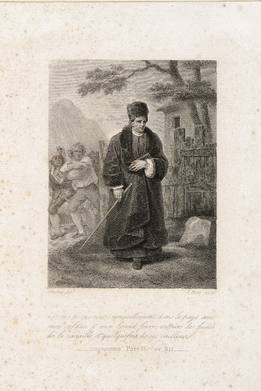 Portrait en pied de Jean-Jacques Rousseau de trois-quarts à droite, en habit à la française, dans une forêt. Il est tête nue, perruque ronde, son tricorne sous le bras droit, tenant une courte canne dans la main gauche. A droite un garçon indique une direction.