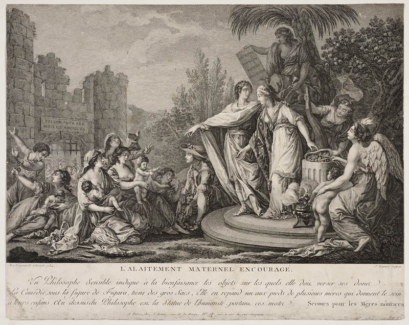 Rousseau montre à la bienfaisance qui elle doit secourir. A droite au fond, l'entrée d'une construction en ruine est surmontée de cette inscription: «PRISON POUR LES / MOIS DE NOURICES.»