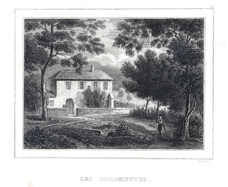 La maison des Charmettes, presque de face, entourées d'arbres. sous un ciel nuageux. Au centre, au premier plan,un soupirail. Sur le sentier, à droite, un homme qui se promène en chapeau haut-de-forme.