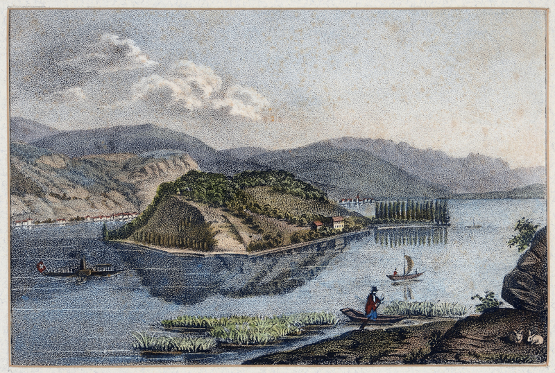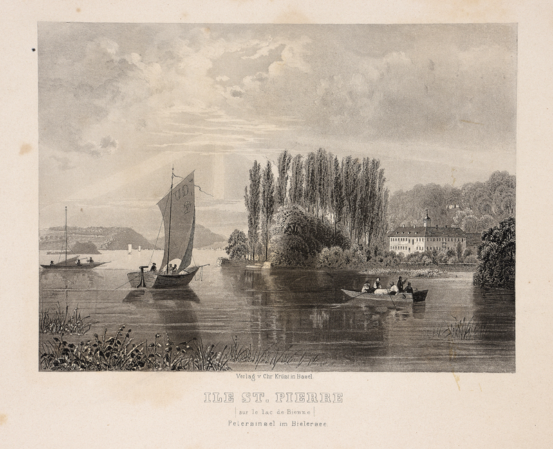 Vue de l'Ile de St-Pierre de l'île des lapins (sur laquelle se trouvent deux lapins), en direction de Bienne. «On remarquera la présence du bateau de Philippe SUCHARD» (FM)