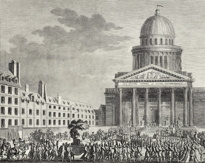 Cortège se déroulant de gauche à droite et entrant au Panthéon. Le dernier plan à gauche est occupé par des maisons. Portée à bras d'hommes, la statue de Rousseau tournée à droite le représente assis sur un fauteuil sous les ombrages d'un arbre.