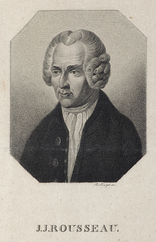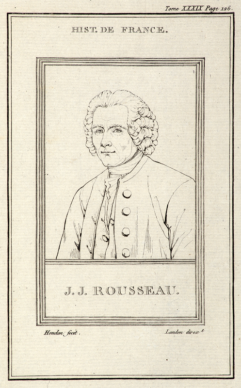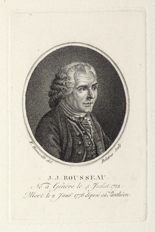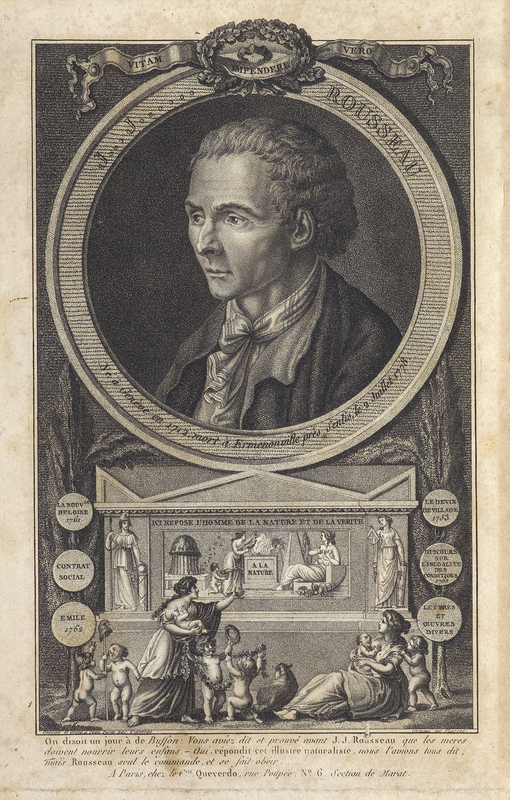 Portrait en buste de Jean-Jacques Rousseau de trois-quarts à gauche, tête nue, perruque ronde, en habit à la française dans un ovale placé (cadre carré avec macarons aux coins) sur une console dont le cartouche porte sa devise.