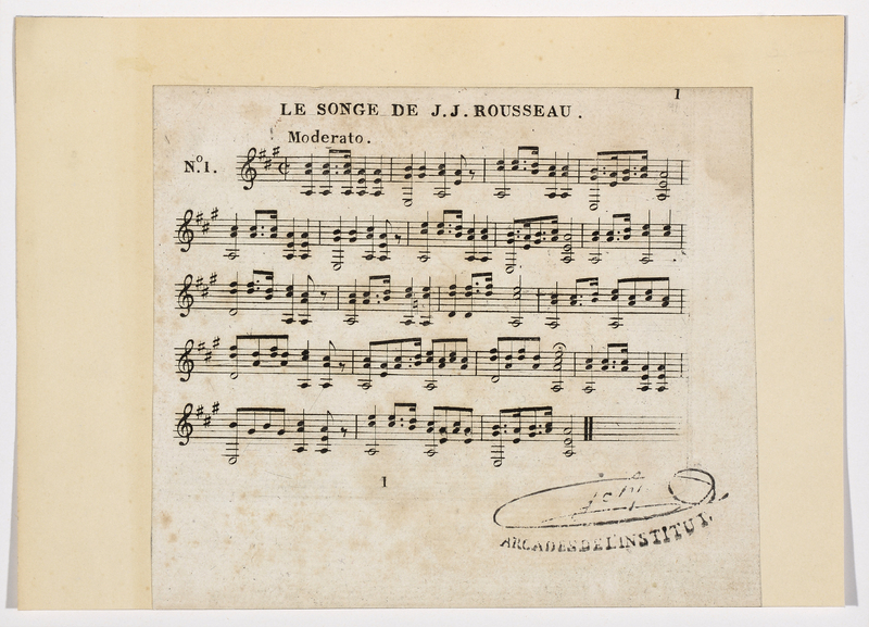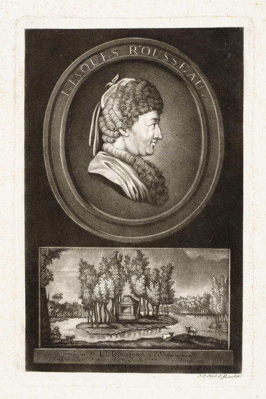 Rousseau de profil à droite en costume arménien, dans un médaillon ovale. Au-dessous, un paysage de forme rectangulaire représentant l'île des Peupliers. Au premier plan, sur la rive, une femme à genoux à côté de son chien, à droite deux vaches dont l'une est couchée.