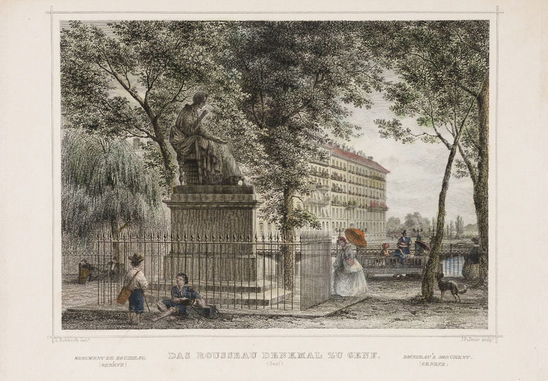La statue de Rousseau (de profil à droite) à Genève est représentée entourée d'arbres et de personnages, dont deux enfants au premier plan, sans oublier deux chiens. Au fond, sur la rive droite du Rhône, on aperçoit l'hôtel des Bergues auquel Rousseau tourne le dos.
