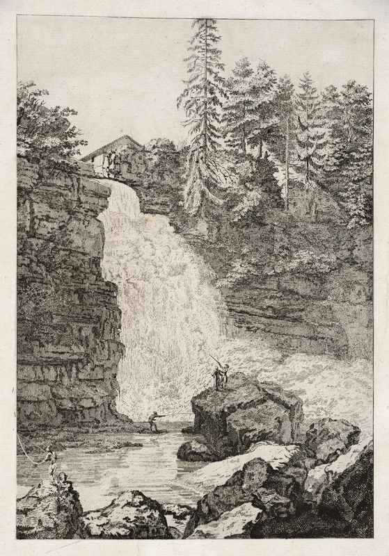 «Au pied de la cascade, quatre personnages dont deux pêcheurs à la ligne. En bas, à gauche, sur le rocher, A G» (BdlT)