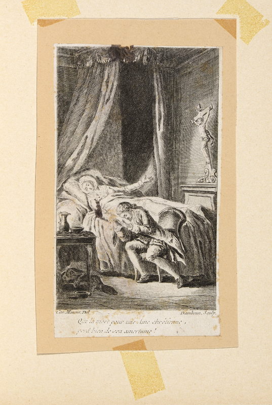 «La Comtesse de Valmont, presque à l'article de la mort, console son époux '» au pied de son lit, assis sous un crucifix.