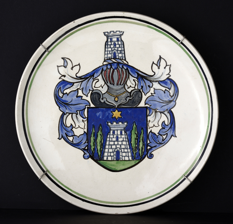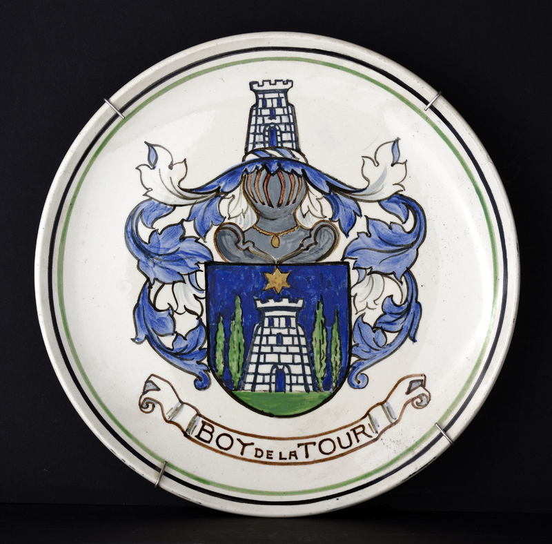 Couvercle en bois noir, ronde, dim. : 86,2, peint, paysage de l'île de Saint-Pierre, maison du receveur, le petit port du Sud, avec une barque qui aborde, à la poupe une jeune fille avec une gaffe qui retient le bateau et tout à droite un homme qui pousse la barque. A mi-chemin un couple, femme debout, homme couché, un fond de montagnes.