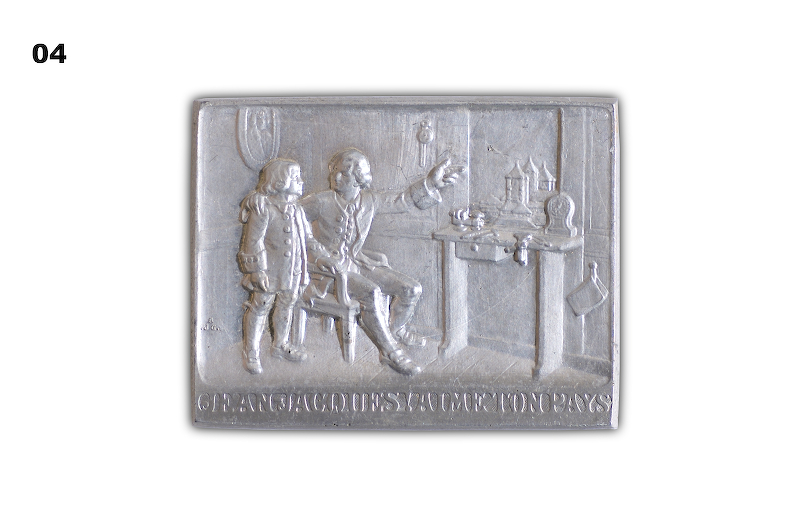 Avers: JEAN-JACQUES ! AIME TON PAYS. Le père de Rousseau lui montre la ville de Genève par la fenêtre ouverte de son atelier. Signé à g.: A.J.G.