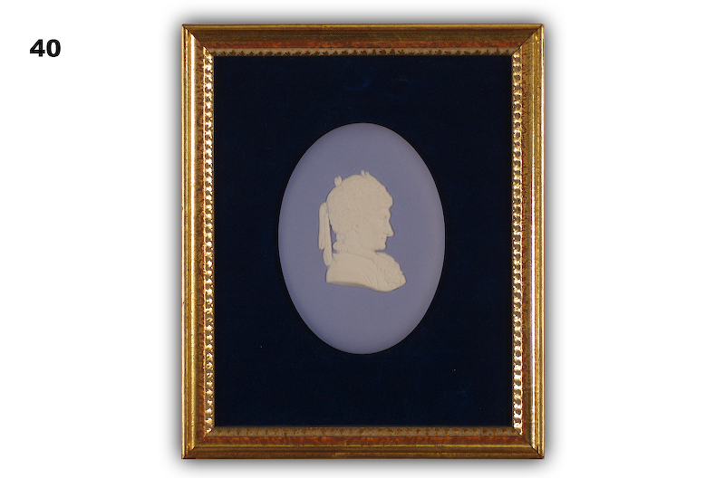 Biscuit blanc genre Wedgwood à fond bleu roi, copie d'une pièce du XVIIIe siècle à l'occasion de la commémoration du 250e anniversaire de la naissance de J.J. Rousseau. Sur velours marine foncé; cadre en bois doré.