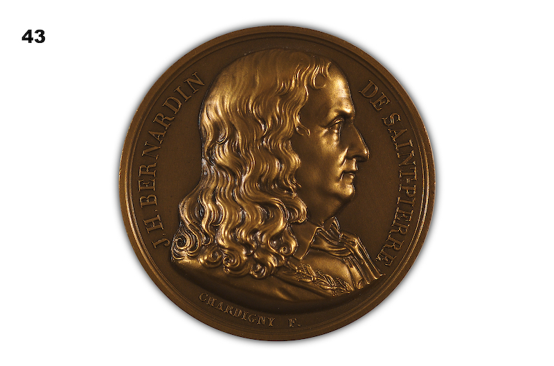 Avers: J.H.BERNARDIN | DE SAINT-PIERRE. Profil à dr., tête nue, cheveux tombant sur les épaules, col fermé. Signé sous le buste: CHARDIGNY F.