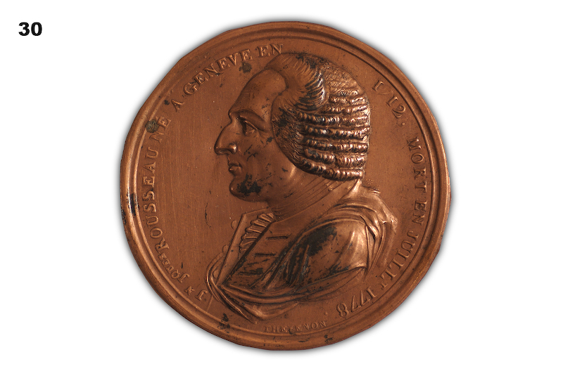 Avers: JEAN JACQUES ROUSSEAU. Profil à g., perruque et habit français. Signé: DUBOIS.F.