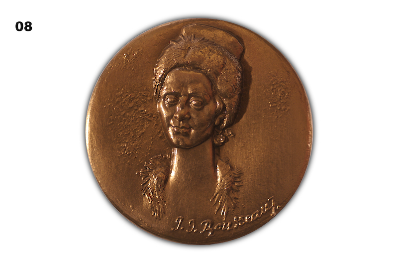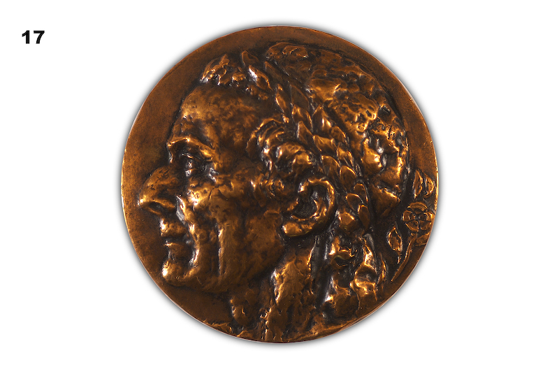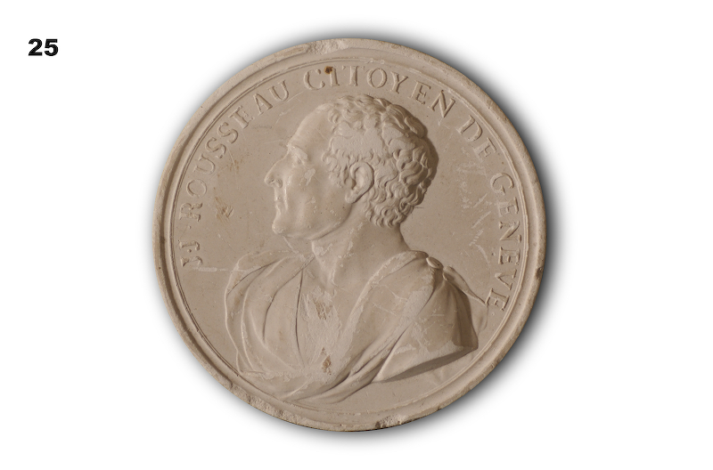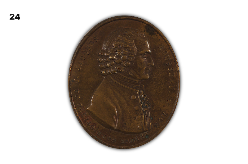 Avers: J.J.ROUSSEAU suivi d'une initiale J. (?). Buste tourné légèrement à g., habit d'Arménien; long cou avec col de fourrure; bonnet du type figuré sur le portrait dû au baron Gérard.