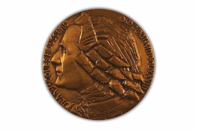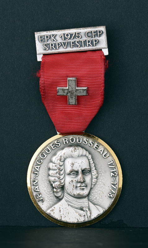 Cette médaille a été commandée par l'Association des Amis de J.-J. Rousseau ' actuellement Association J.-J. Rousseau, Neuchâtel ' et frappée dans les ateliers d'Huguenin Médailleurs, au Locle (NE). Le buste d'après Houdon *, acquis à l'instigation de la Société et offert par la Société de Banque Suisse à la Bibliothèque de la Ville de Neuchâtel pour la Salle Rousseau de la Bibliothèque Publique et Universitaire de Neuchâtel, a servi de modèle. Présenté pendant l'été et l'automne 1978 dans l'exposition Rousseau et la Suisse dans le hall du Collège latin, il a été exposé dans la Salle Rousseau de 1982 à 2013, avant sa transformation en Espace Rousseau inauguré en mai 2014.