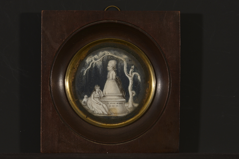 En grisaille sur fond noir, portrait de Rousseau ( ?), en buste de profil à gauche sur un socle pyramidal et sous un saule pleureur cassé. A gauche, assise et pensive, une jeune femme et un caniche. Inscription sur le bord du socle: «je. pleurs [sic] sa mort / et ma vie».