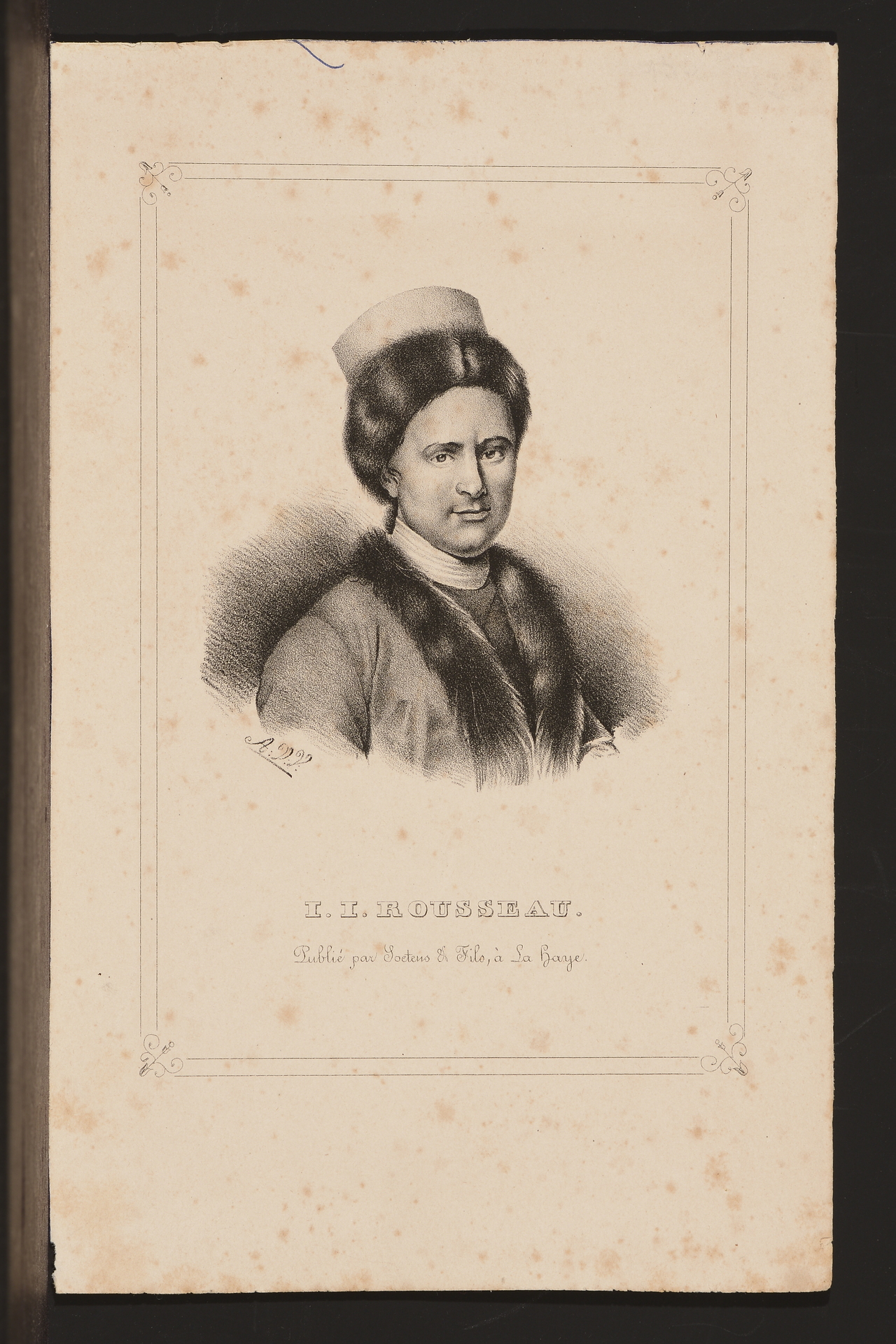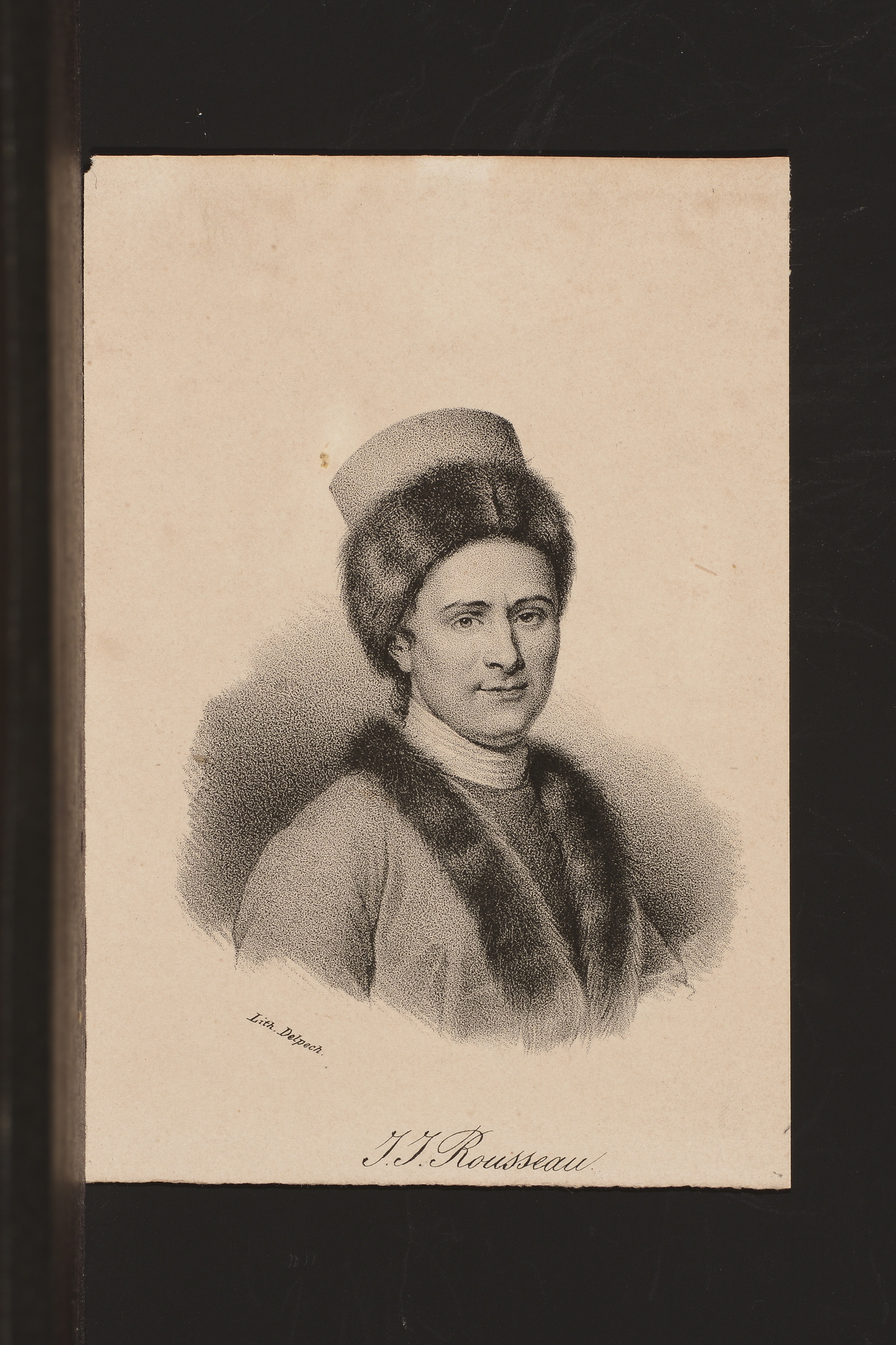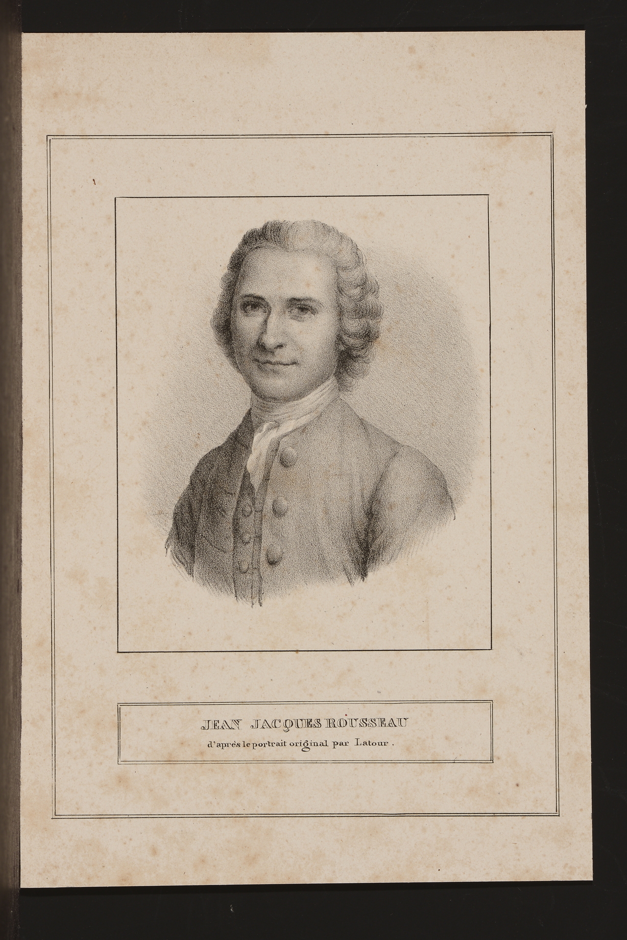 Portrait de Rousseau, en buste de trois-quarts tourné à droite en habit arménien, sur fond neutre, d'après Gérard. Le tout entouré d'un double trait carré orné aux angles.