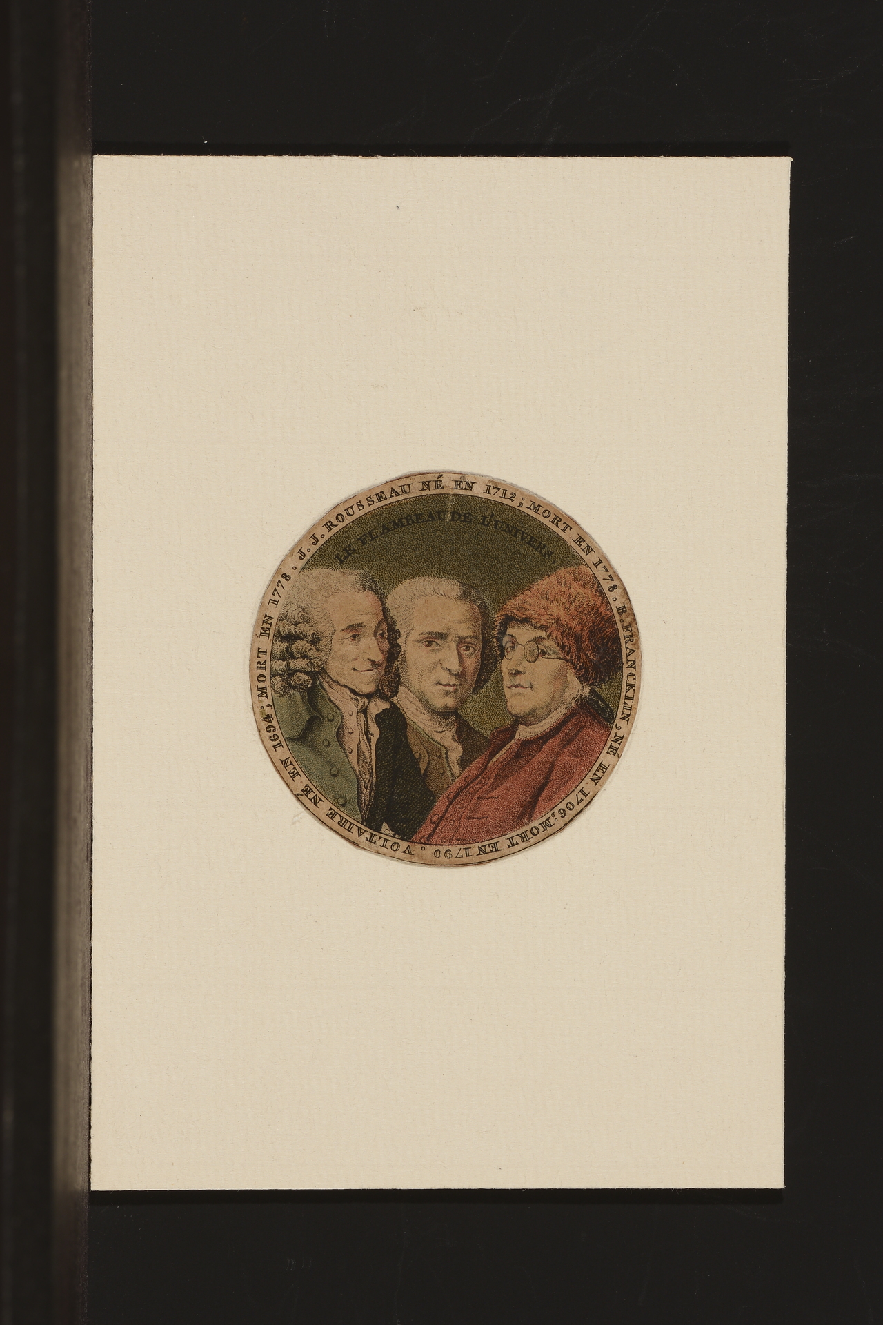 Grisaille sans signature sous forme de médaillon rond formant dessus de boîte et représentant les bustes superposés de Voltaire. Rousseau, Francklin, les deux premiers tête nue de profil à droite, le 3e avec un bonnet de fourrure de profil à gauche.
