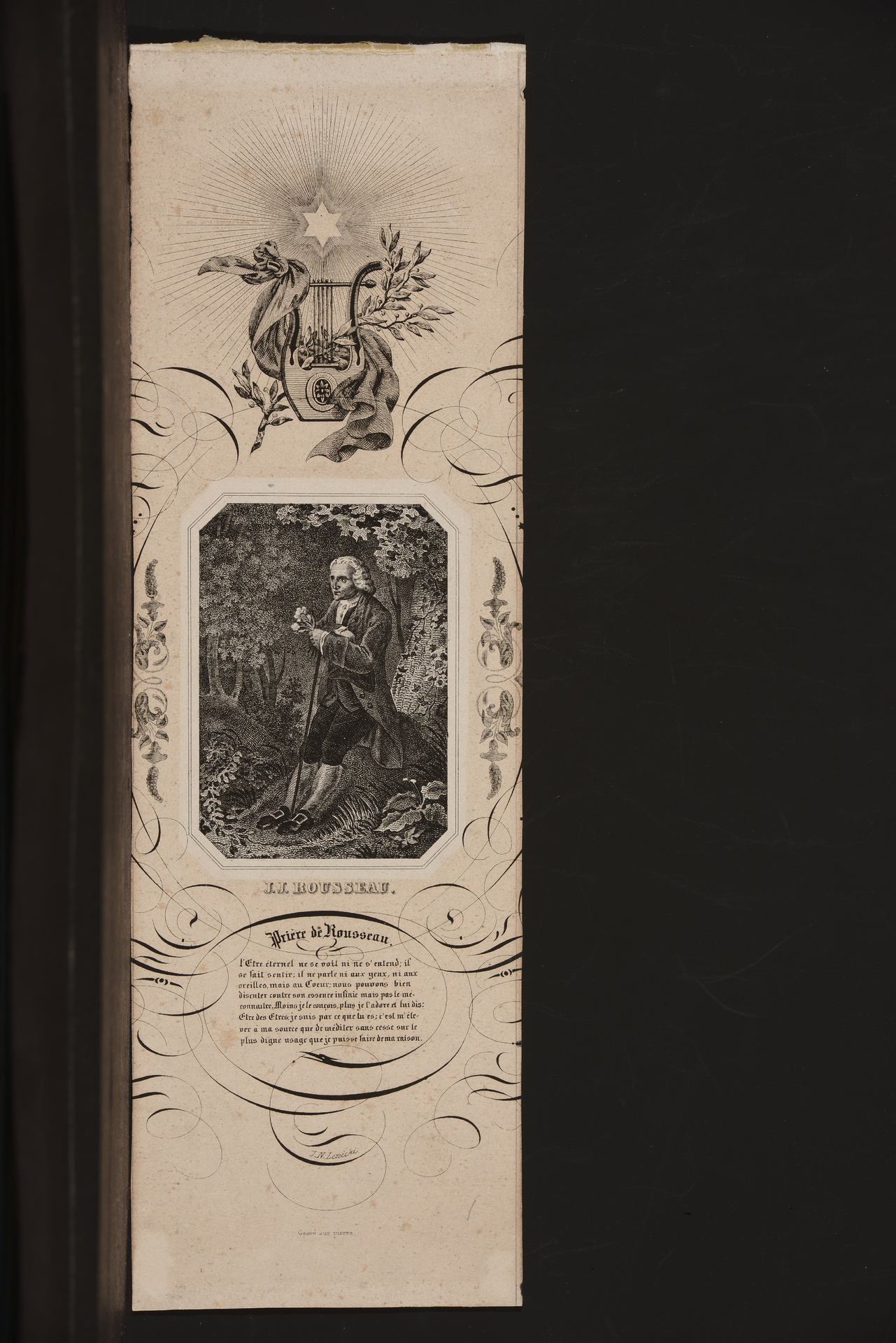 Au-dessous, J.J. Rousseau, puis «Prière de Rousseau.»: «l'Etre éternel ne se voit ni ne s'entend; il / se fait sentir; il ne parle ni aux yeux, ni aux / oreilles mais au Cœur; nous pouvons bien / discuter contre son essence infinie mais pas le mé= / connaitre. Moins je le conçois, plus je l'adore et lui dis: / Etre des Etres; je suis parce que tu es; c'est m'éle- / ver à ma source que de méditer sans cesse sur le / plus digne usage que je puisse faire de ma raison.» (en lettres gothiques)