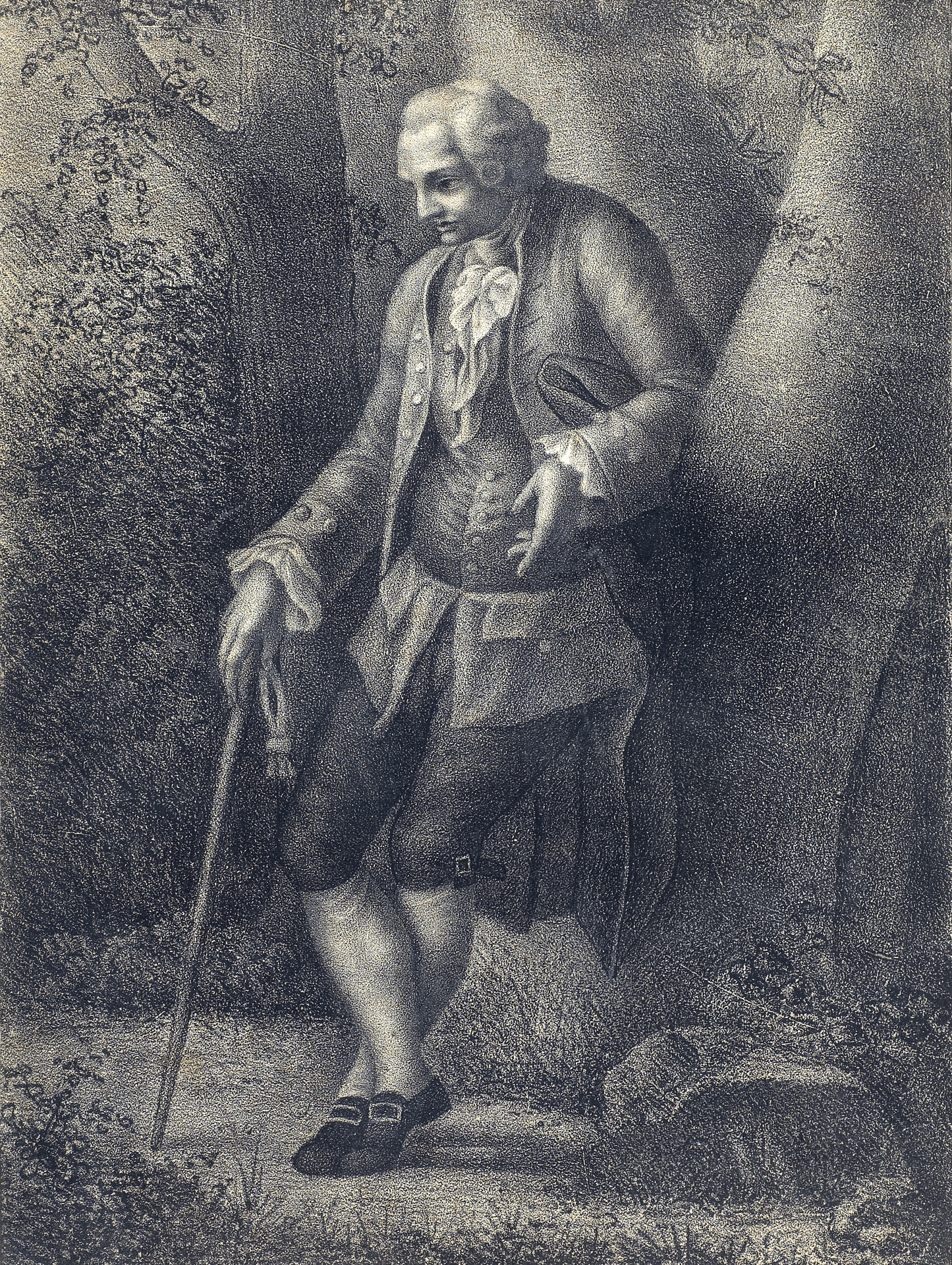 Portrait en pied de Jean-Jacques Rousseau de trois-quarts à gauche, en habit à la française, dans une forêt. Il est tête nue, perruque ronde, son tricorne sous le bras gauche, tenant une courte canne dans la main droite.