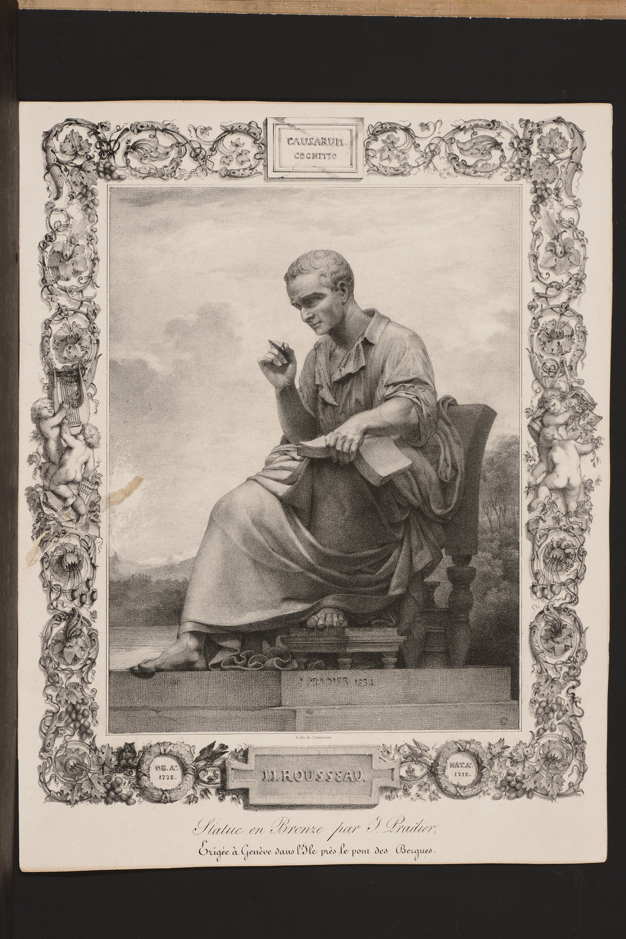 Statue de Rousseau en bronze par Pradier, représenté en pied de trois-quarts gauche, inaugurée en 1835. Il est assis le bras droit levé, un crayon dans la main, un livre ouvert sur le genou gauche. Un large cadre orné de feuillages, de fruits ainsi que d'instruments de musique et d'une boîte à herboriser tenus par des paires de chérubins entoure le monument. Sur le socle est gravé «J. PRADIER. 1834» et un «chiffre» (SC ?) se devine à l'angle inférieur droit.