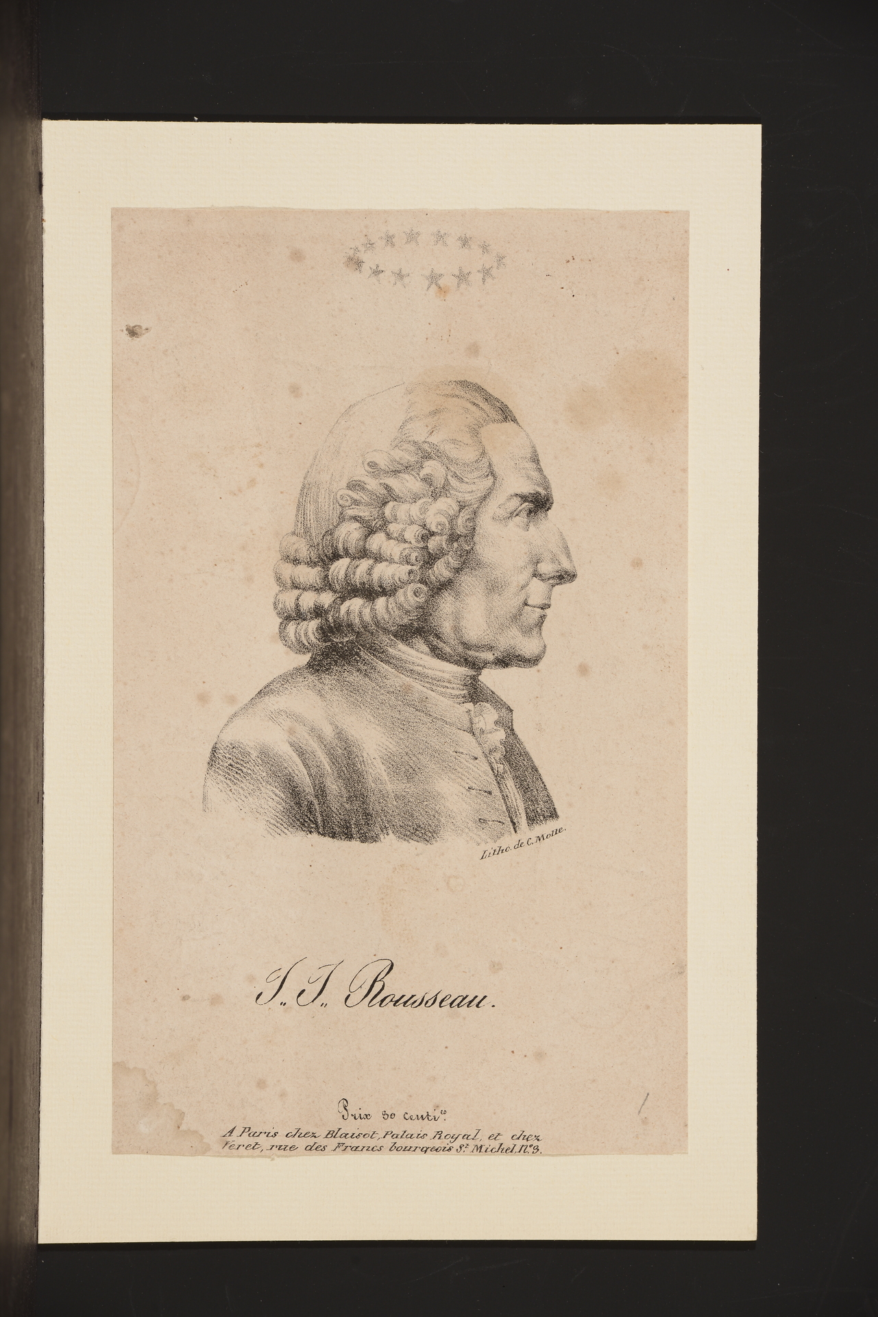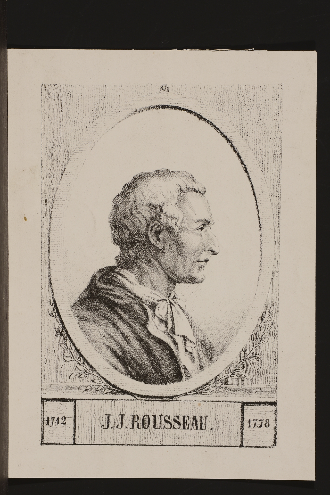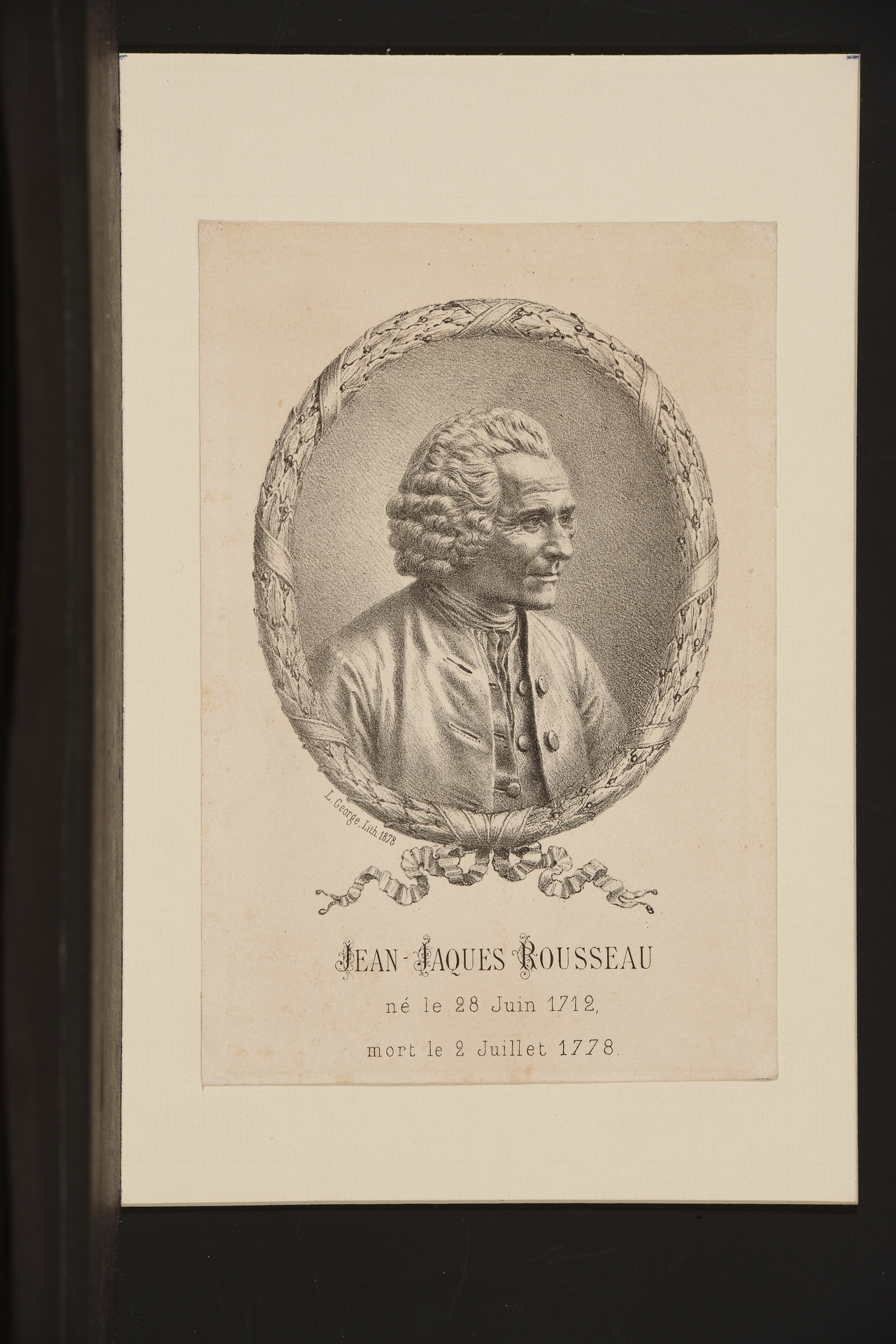 Portrait de Rousseau, en buste de trois-quarts tourné à droite, tête nue et perruque ronde, en habit à la française. Représenté dans une couronne de laurier attachée en bas par un nœud de ruban.