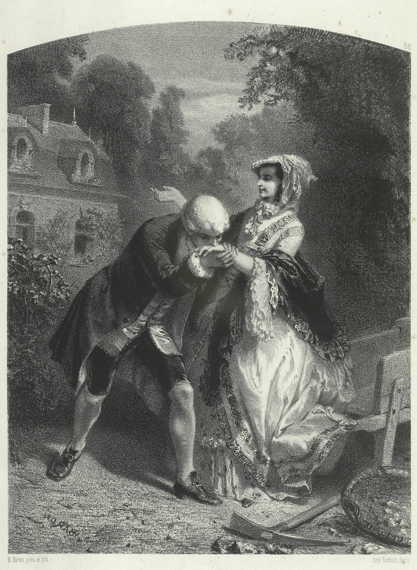 Dans un parc, Mme d'Epinay à droite de profil à gauche, tend sa main à Rousseau qui, tête nue, l'embrasse tendrement en s'inclinant de trois-quarts à droite. A gauche, une maison.