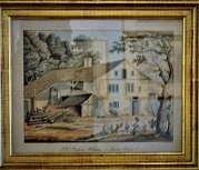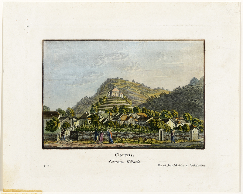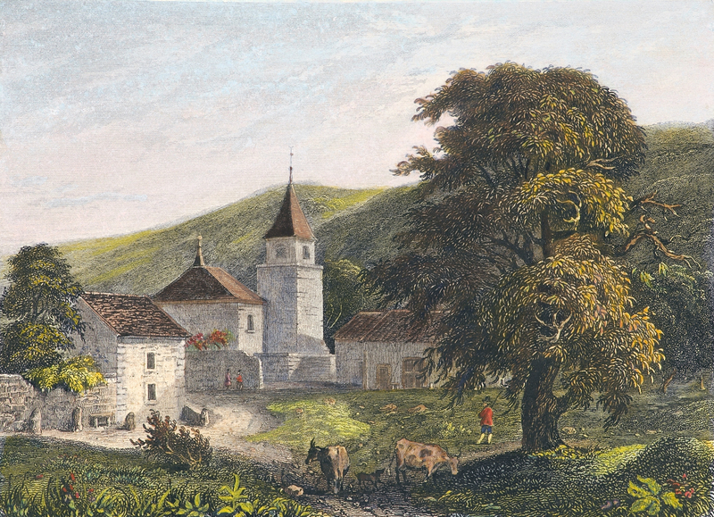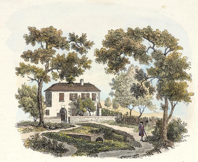 La maison des Charmettes, presque de face, entourées d'arbres. sous un ciel nuageux. Au centre, au premier plan,un soupirail. Sur le sentier, à droite, un homme qui se promène dont le chapeau en haut-de-forme de la gravure de Hamilton / Guyot (voir 92.5.52) est remplacé par un chapeau rond.