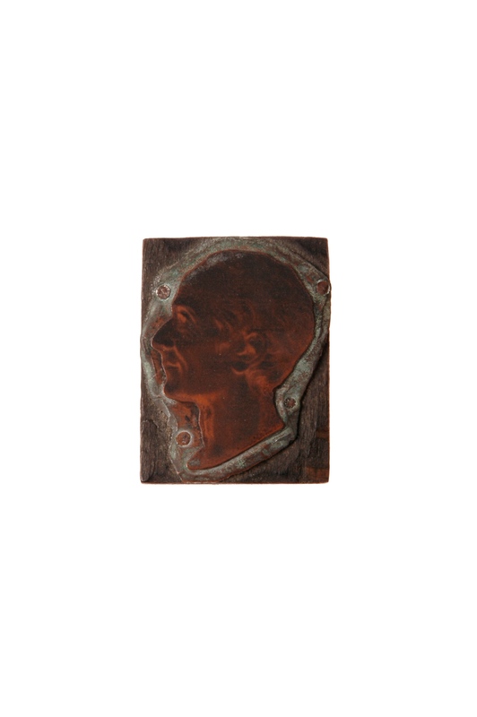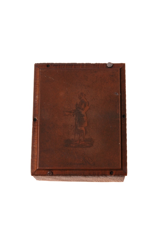 Montée sur un bloc de bois, la plaque de cuivre rectangulaire gravée présente l'image traditionnelle du Rousseau herborisant, debout, de profil à gauche, tête nue, chapeau sous le bras gauche qui tient la canne, un bouquet à la main droite portant un bouquet.