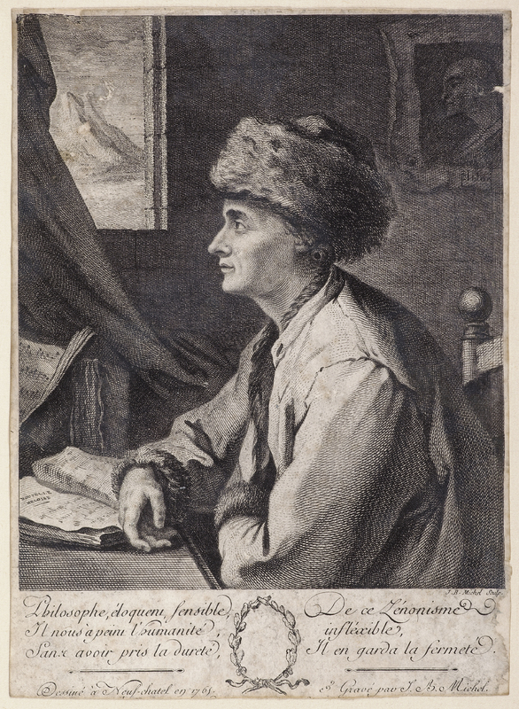 Portrait de J. J. Rousseau «représenté à mi-corps, assis sur une chaise, dans une chambre. Il est tourné de profil à gauche. Il porte l'habit et le bonnet d'arménien. La main gauche est glissée dans le gilet, entr'ouvert; la main droite repose sur la tableet sur un exemplaire ouvert de la Nouvelle Héloïse. On y voit encore un autre livre, et un cahier de musique.