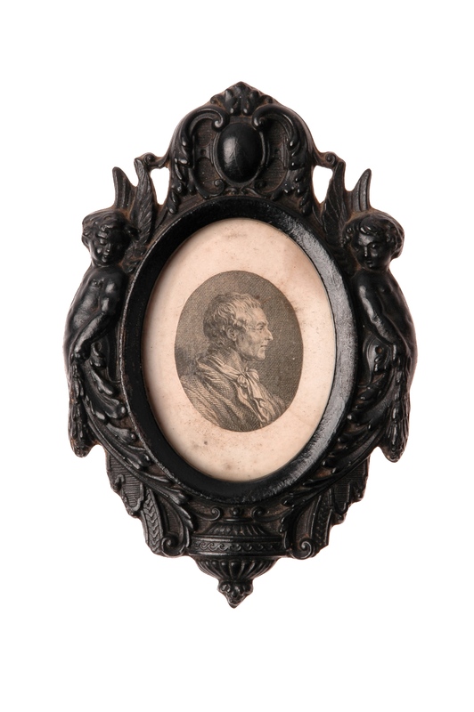 Dans un cadre de bois ovale avec un ornement sculpté, style «graveur des ours bernois», entouré de deux putti se terminant en queue de verdure, dont les ailes embrassent une ove, une gravure représente Rousseau en buste tourné de profil à droite, tête nue, cheveux au naturel.