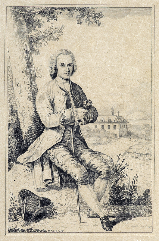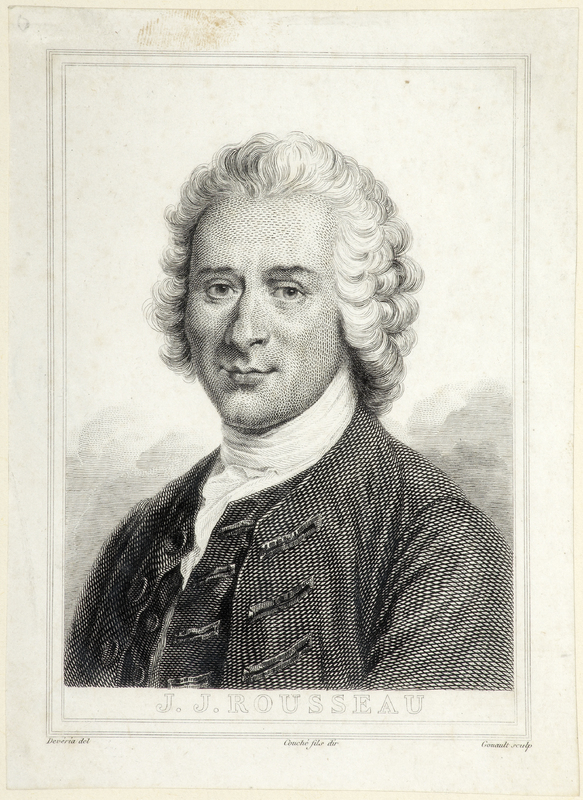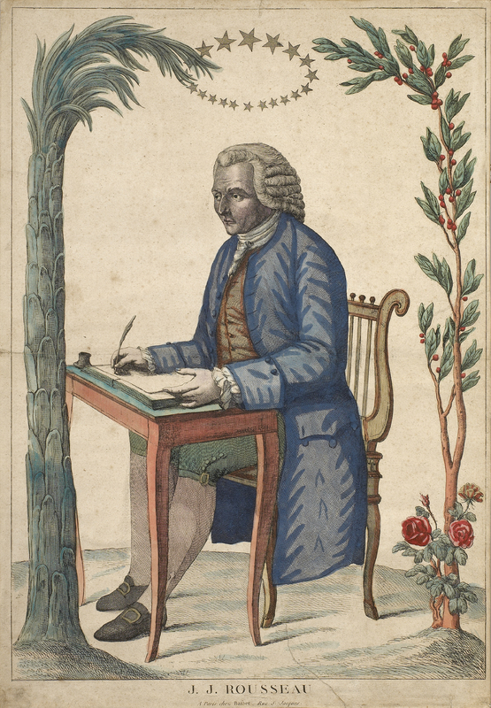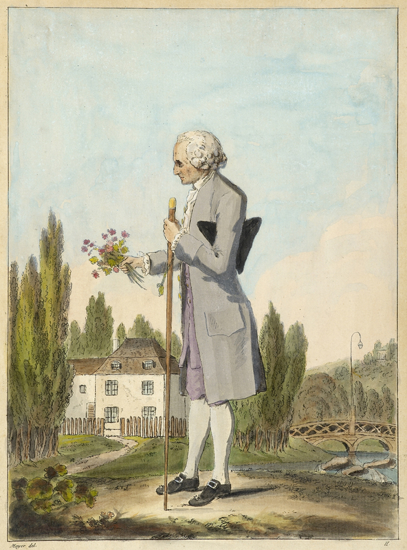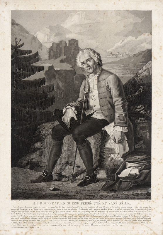 Portrait de J. J. Rousseau «représenté en pied, assis sous un arbre au bord d'un chemin. Il est nu-tête, et porte l'habit de Rousseau herborisant. Il a croisé les mains sur sa canne qu'il tient entre ses jambes; dans la main droite, quelques fleurs qu'il a cueillies. Son tricorneest posé à terre sur un livre.