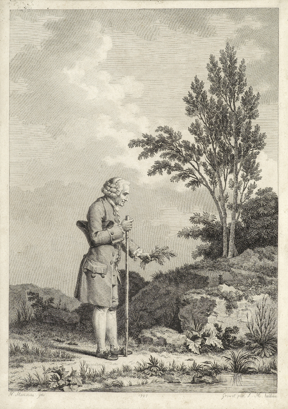 «La silhouette de Rousseau herborisant est née de son séjour à Ermenonville. Mais la "Cinquième promenade" des "Rêveries du promeneur solitaire" a incité certains graveurs à représenter Jean-Jacques dans le paysage de l'Ile de St-Pierre.» (FM)