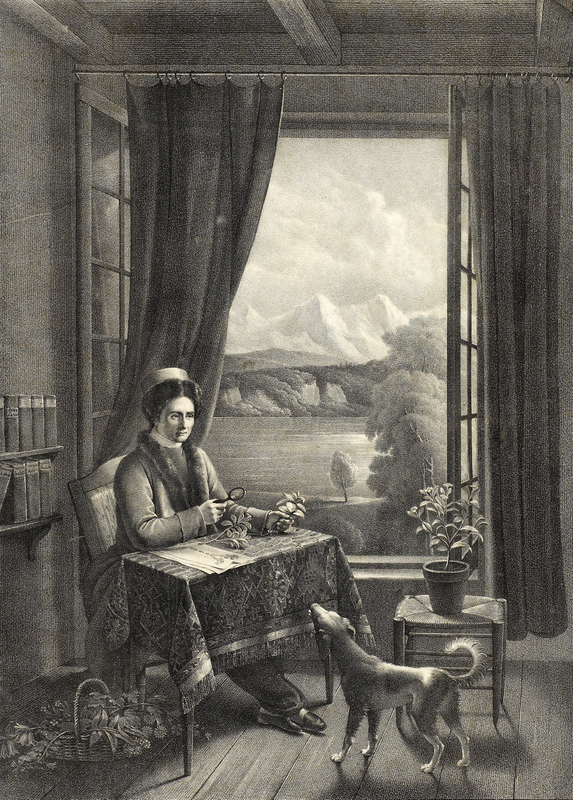 Derrière le chien un tabouret porte un pot contenant une plante fleurie. La chambre s'ouvre ' par une large fenêtre, ornée de rideaux passés à une tringle ' sur un paysage: celui de l'île de St. Pierre avec le lac, des falaises sur l'autre rive et les Alpes bernoises dans le fnd. Plancher de bois et plafond à poutres apparentes.» FM)