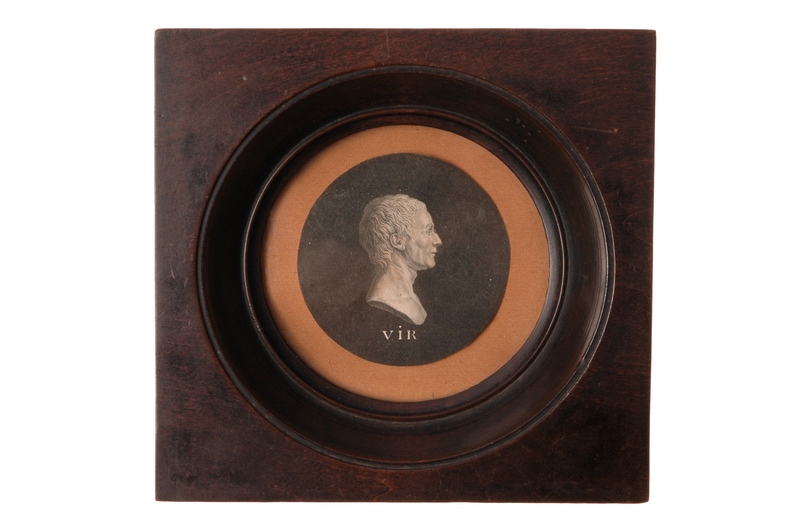 Cadre rectangulaire de bois creusé d'un cercle contenant un buste gravé de Rousseau sur fond noir, profil à droite, nu tête, chevelure au naturel, épaules nues. Au dessous, en blanc, l'inscription Vir.