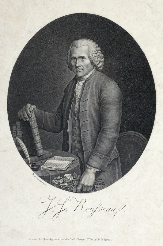 Portrait de J. J. Rousseau au pointillé, «représenté debour à mi-corps, tourné de trois-quarts à gauche, en habit de citoyen de Genève.