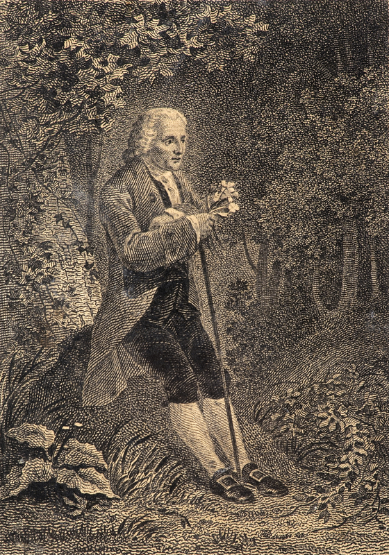 Portrait de Rousseau. «Dans un paysage boisé, on voit Rousseau, assis sur un tertre au pied d'un arbre. Il est en train d'herboriser. Le philosophe se repose appuyé sur sa canne; il est tourné de trois.quarts à droite; [les bras croisés,] il tient un bouquet de fleurs [pervenches] d'une main. son chapeau de l'autre.» (FM)
