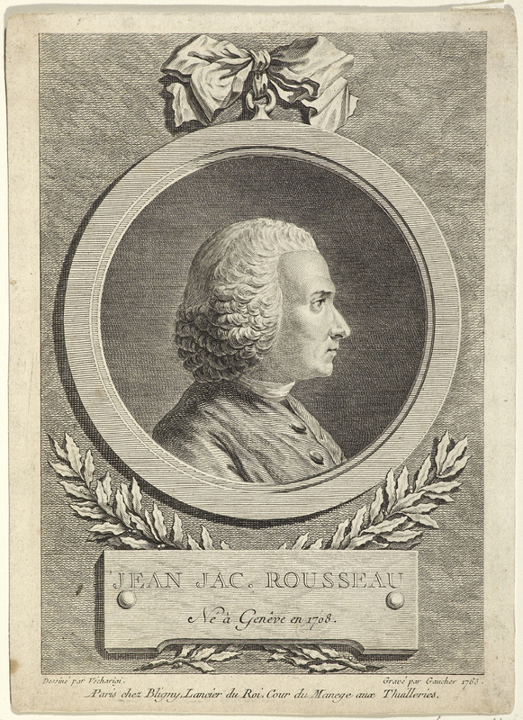 Portrait de J. J. Rousseau portant «l'habit du "citoyen de Genève"; le visage est légèrement tourné à gauche; il est tête nue; le buste est tourné de trois-quarts à gauche.