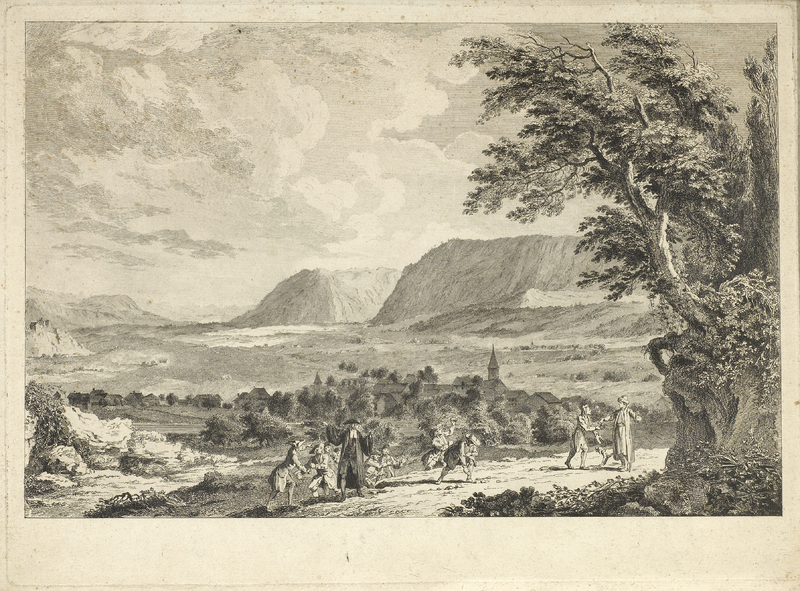 A gauche, un sapin; à dr. et à g. au deuxième plan, des rochers dénudés. A dr. derrière Rousseau, on voit un lac et un bourg sur la rive opposée.