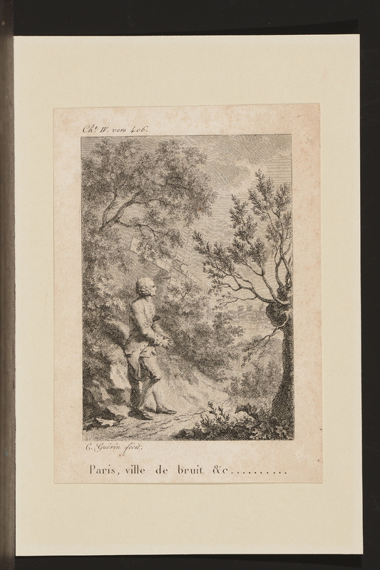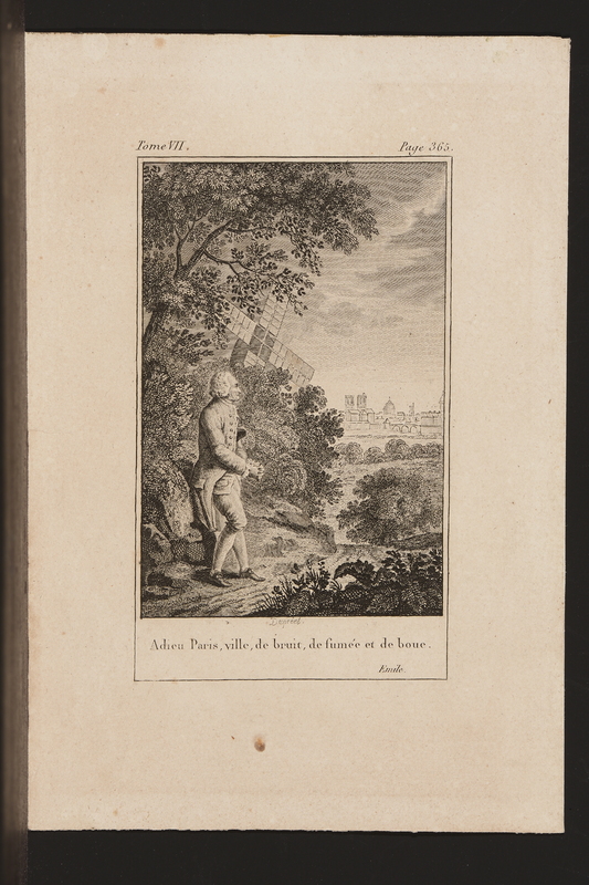 Sur un chemin qui mène vers Paris dont on voit au loin l'île de la Cité et qui passe près d'un moulin à vent, un homme (Jean-Jacques Rousseau), tête nue et le tricorne sous le bras gauche, joint les mains en regardant la ville, debout sous un arbre.