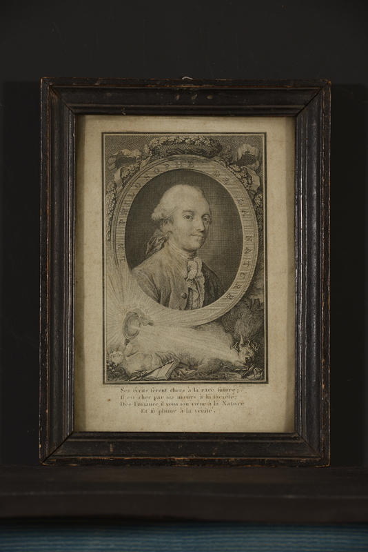 Portrait en buste de Jean-Jacques Rousseau de trois-quarts à gauche, tête nue, perruque ronde, en habit à la française dans un ovale placé (cadre carré avec macarons aux coins) sur une console dont le cartouche porte sa devise.
