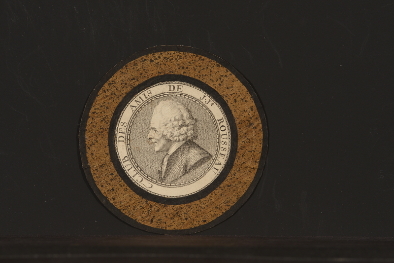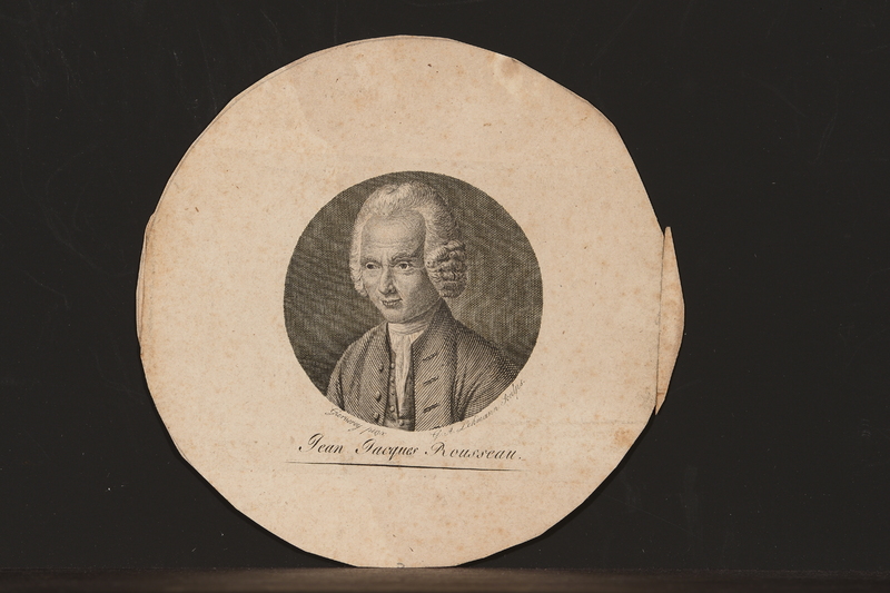 Portrait en buste de Rousseau de profil gauche, en habit à la française et perruque dans un médaillon rond. Le cercle découpé a été fixé sur un papier et entouré de deux larges traits à l'encre de Chine limitant un cercle brun granulé de points noirs.