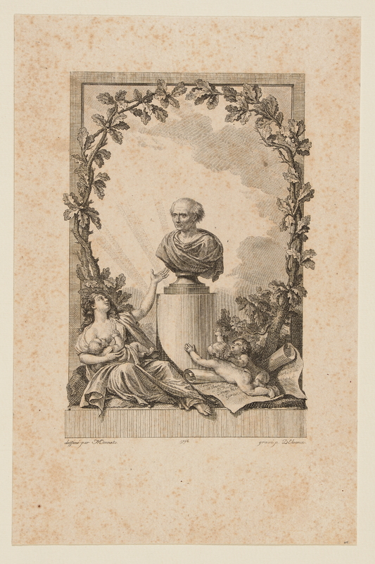 Portrait en buste de Jean-Jacques Rousseau, tête nue sans perruque, de trois-quarts à gauche, un portefeuille sous le bras gauche, dans un cadre ovale de feuilles de chêne serrées par un ruban qui s'achève en bas par un nœud. Fond d'arbres.