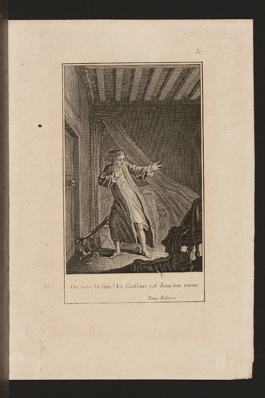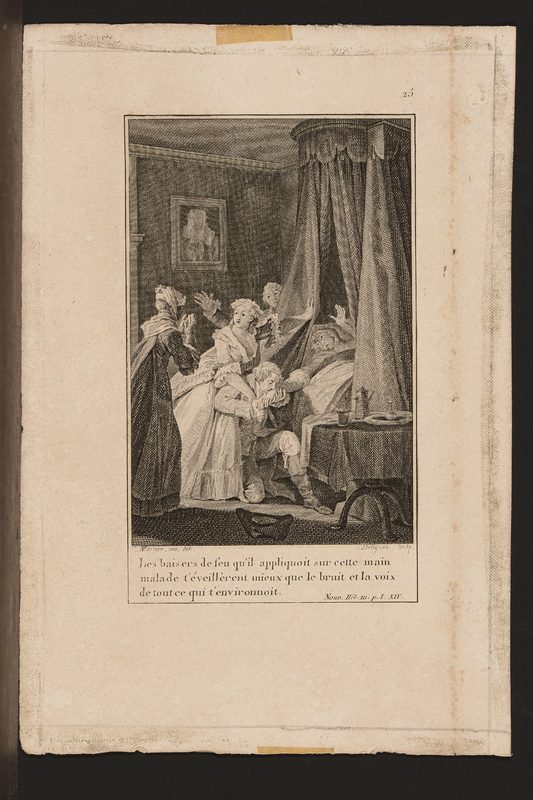 Dans une chambre à coucher, Julie est dans le lit sous un dais. A droite Saint-Preux à genoux à côté du lit baise la main de la malade. Mme d'Orbe tente de l'écarter. Une tête d'homme apparaît derrière le haut du lit. Une femme debout à gauche joint les mains. A droite devant le lit une table ronde avec un plat, cruche, cafetière et verre et médecine. Sur le mur au fond, un portrait.