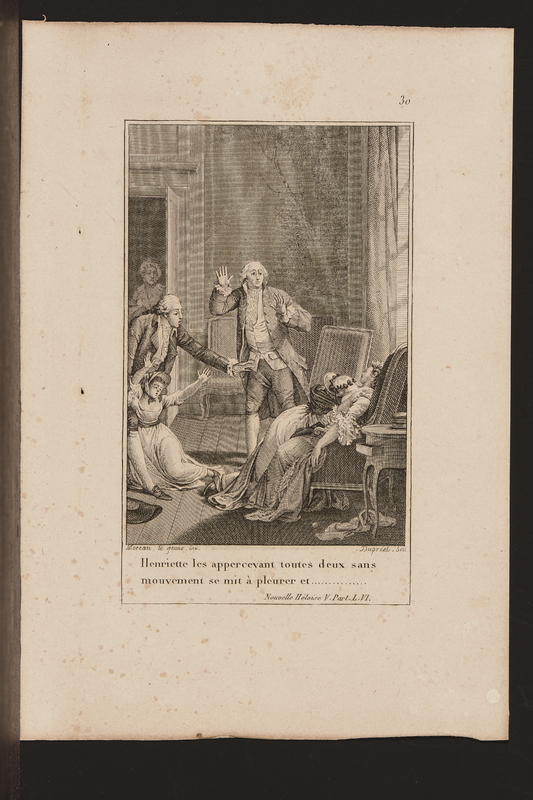 La vignette représente une pièce dans laquelle, à droite Julie est évanouie dans un fauteuil, de profil gauche;Claire l'embrasse à genoux. A gauche, on aperçoit Saint-Preux, M. de Wolmar et Henriette qui, à genoux, lève les bras. A l'arrière, une femme regarde par la porte ouverte.