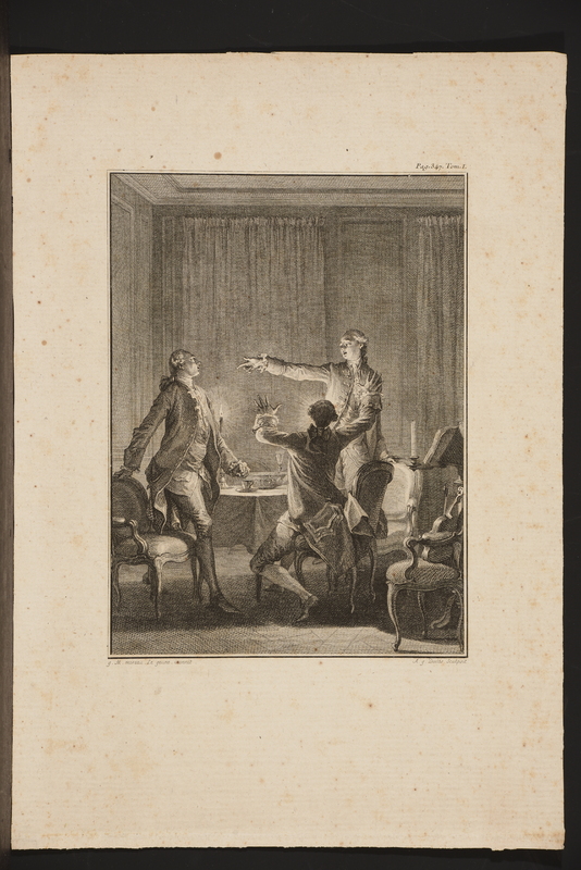 Dans une chambre autour d'une table sur laquelle se trouvent un bol de punch, une coupe, une tasse et deux chandeliers qui éclairent la scène., Mylord Edouard et Saint-Preux sont debout et se disputent. M. d'Orbe, de dos, assis entre eux deux lève les bras au ciel et cherche à les calmer. A droite, un lutrin et un violon posé sur un fauteuil.