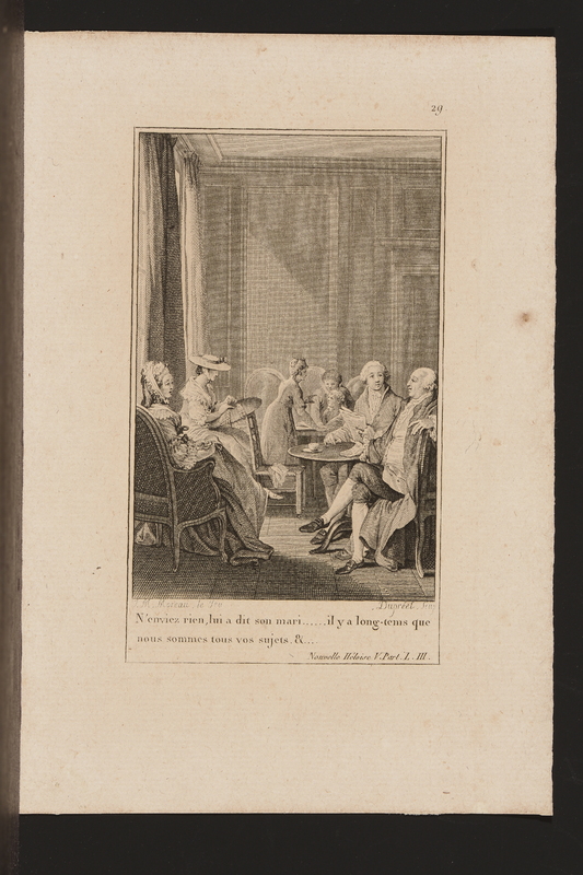 La vignette représente un salon; à droite auprès d'une petite table ronde sont assis M. de Wolmar et Saint-Preux, qui tient un journal. A gauche, au premier plan, une femme est assise dans un fauteuil, de profil à droite. Au fond près d'une fenêtre, une autre femme coiffée, de profil à droite, travaille sur un coussin de dentelière.Au dernier plan au milieu, des enfants jouent, écoutant une femme debout.