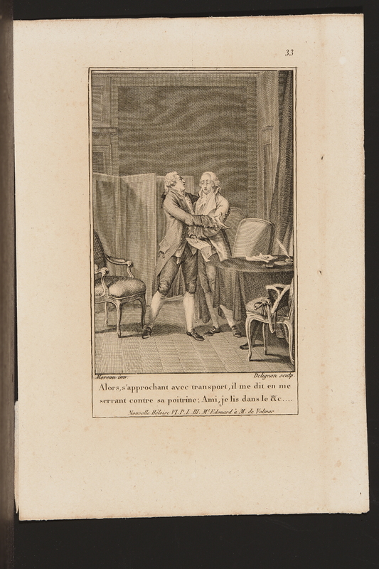 Saint-Preux tient dans ses bras Milord Edouard dans une chambre coupée au fond à gauche par un paravent devant lequel est placé un fauteuil. A droite se trouve une table ronde napée sur laquelle est étalé un nécessaire d'écriture. Près d'elle, une chaise où sont posés une épée et un tricorne.